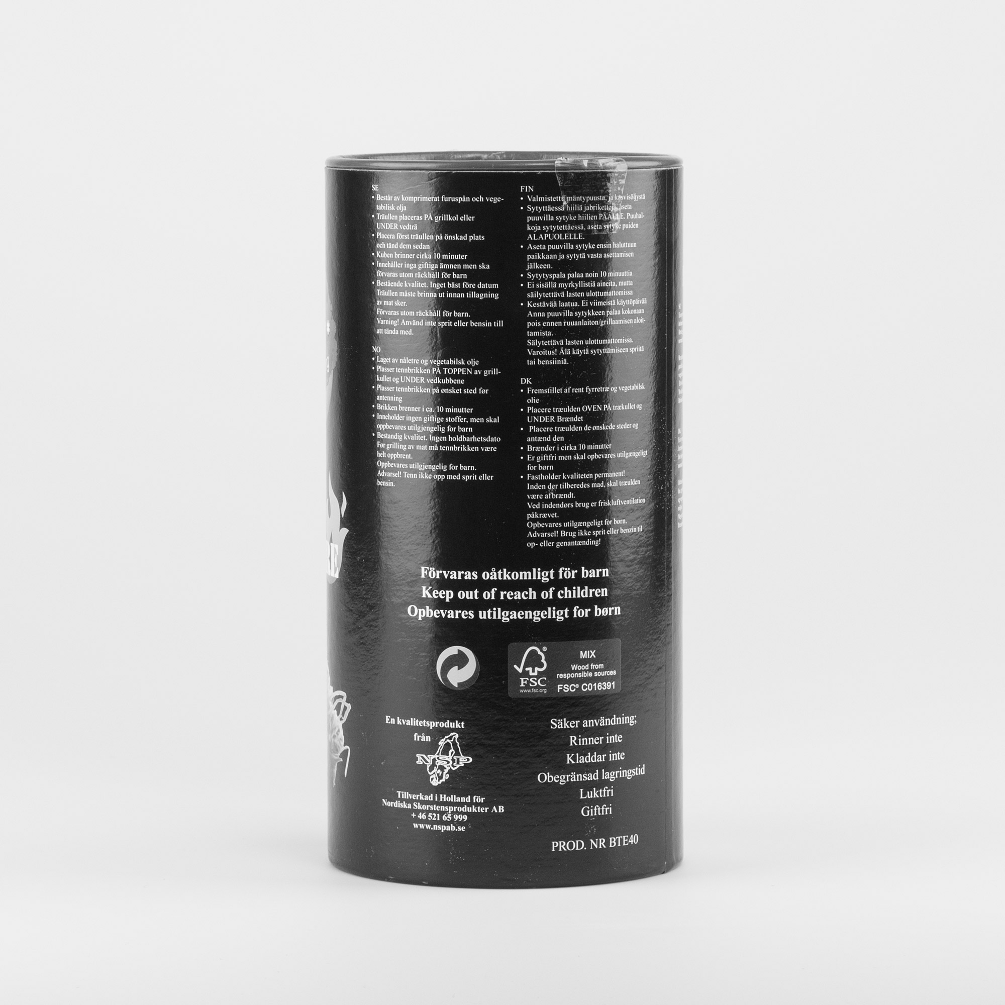 En mycket effektiv braständare. Brinner med stor kraftig låga. Tillverkad av enbart naturmaterial och skiljer sig därmed från vita tändpåsar av paraffin, som härstammar från petrokemisk industri. Utmärkt även som grilltändare.
