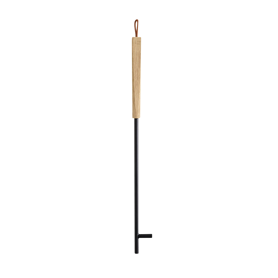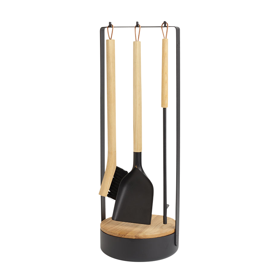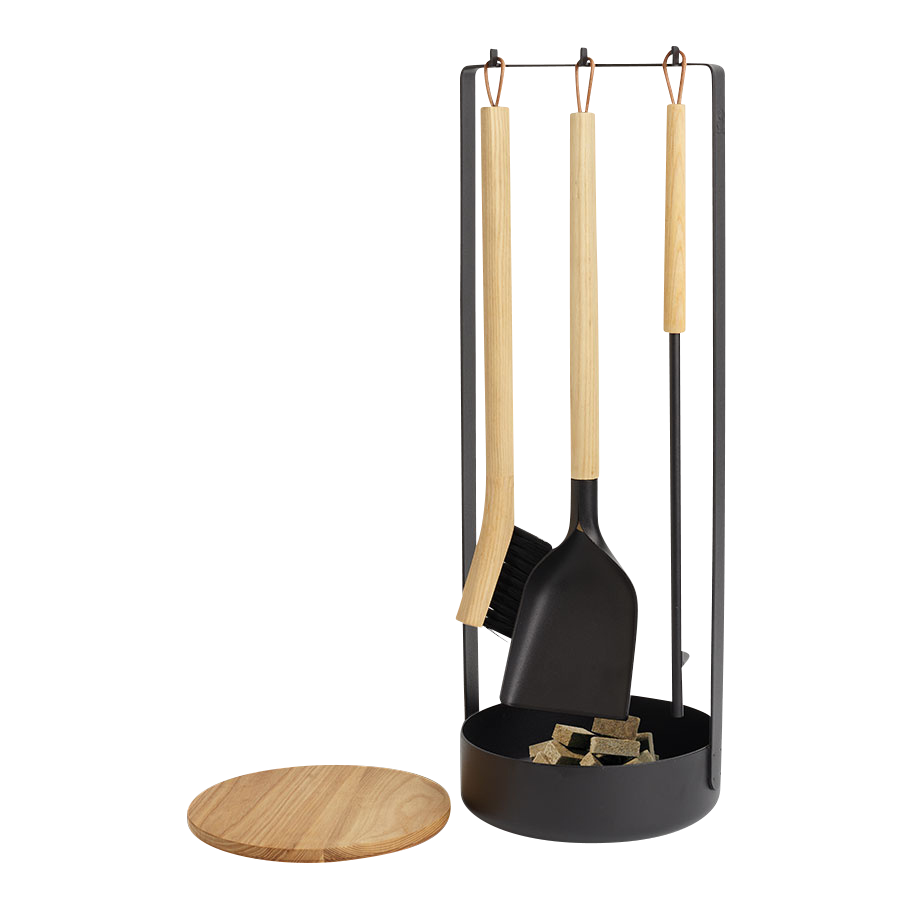 I designen av detta eldställ har man lagt vikt vid både estetik och funktionalitet. Satsen består av skyffel, borste och eldgaffel för att kunna flytta runt veden.
